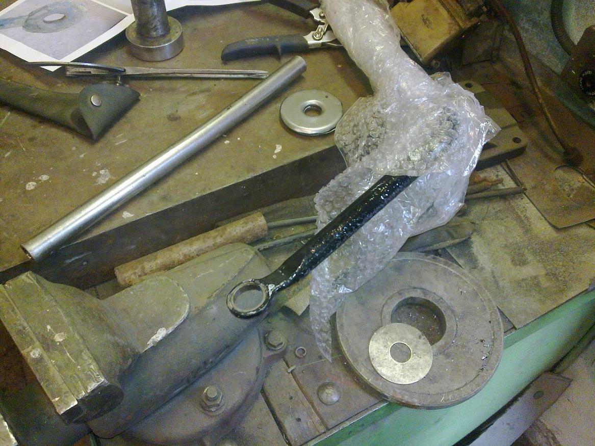 Ano, stabilizátor i s okem je výkovek. Stačí vzít odpovídající trubku nebo kousek plechu, který se vloží do toho oka. Potom se musí udělat ty 2 misky s odpovídajícím průměrem 23mm a tak, abych pevně držely v tom oku. Potom se jen nasadí ty 2 misky z obou stran do oka a obvaří do kolem dokola. A je hotovo.