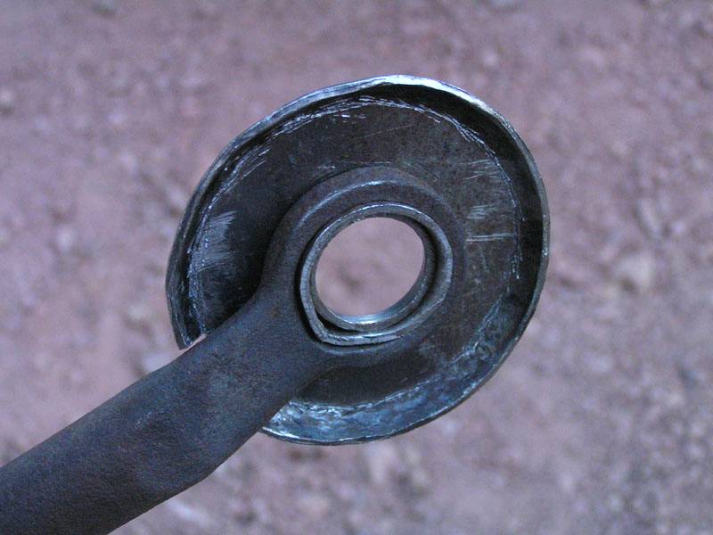 Ano, stabilizátor i s okem je výkovek. Stačí vzít odpovídající trubku nebo kousek plechu, který se vloží do toho oka. Potom se musí udělat ty 2 misky s odpovídajícím průměrem 23mm a tak, abych pevně držely v tom oku. Potom se jen nasadí ty 2 misky z obou stran do oka a obvaří do kolem dokola. A je hotovo.