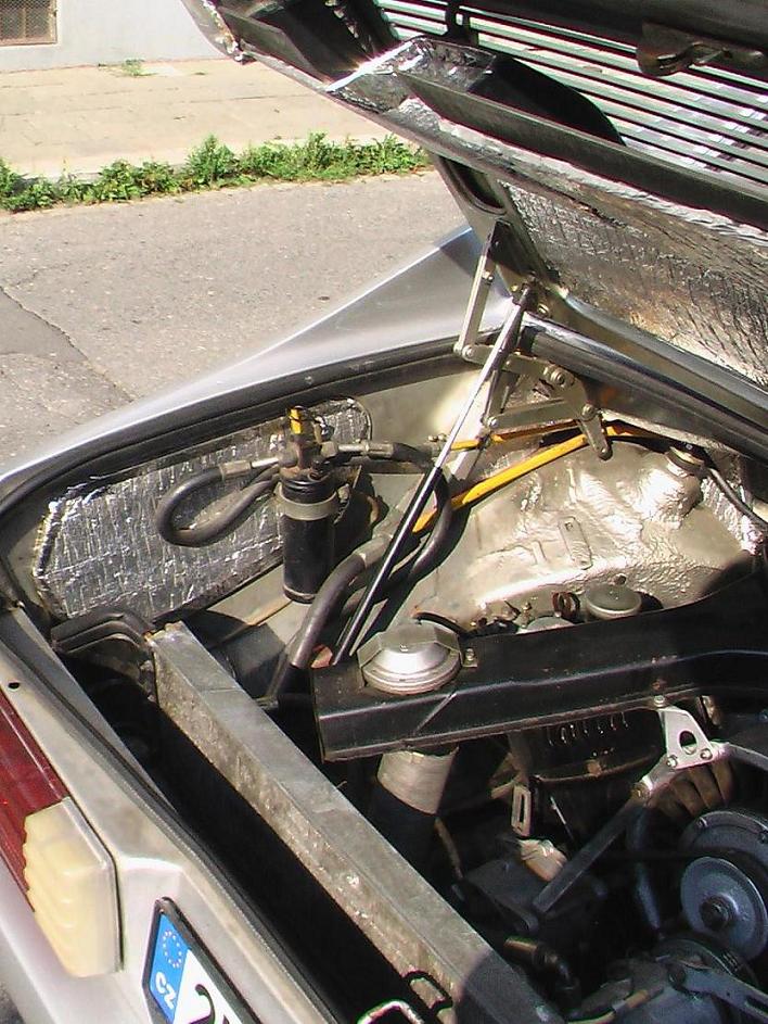 Viem , že na mojom aute je kopec práce, a niekomu sa to bude zdat vyhodený peniaz, ale aj tak som dotoho išiel, lebo som mal íst v piatok pre "novú" prednú kopotu, z ktorej však zišlo (ak by niekto mal napredaj tak dajte vediet), tak sme sa odrieagovali blbostami...a dopadlo to tak ako je na fotkách... vspery z favorita, za cca 150kč, pri otvorení treba prekonat určitú silu, apotom sa kapota otvorí sama, pri zatváraní takisto treba impuls sily, a kapota sa sama zavre(bez dotlačovania). vietor mi už kapotu na chrbát nezhodí... treba vyvrtat dve 8,2mm diery do "L držiaku" kapoty pre vrchný gulový čap vspery, a to je všetka neštandartná úprava na tatrofke. Dalej treba zohnút plocháč patričnej hrúbky do "L-ka" a ten opatrit sadou dier, jednu na upnutie gulového čapu vspery a dvoch dier na upnutie do povodného napínakú pružiny, za pomoci povodnel závlačky, ktorá vytvorí z drážok pre napínanie pružiny diery :wink: ...