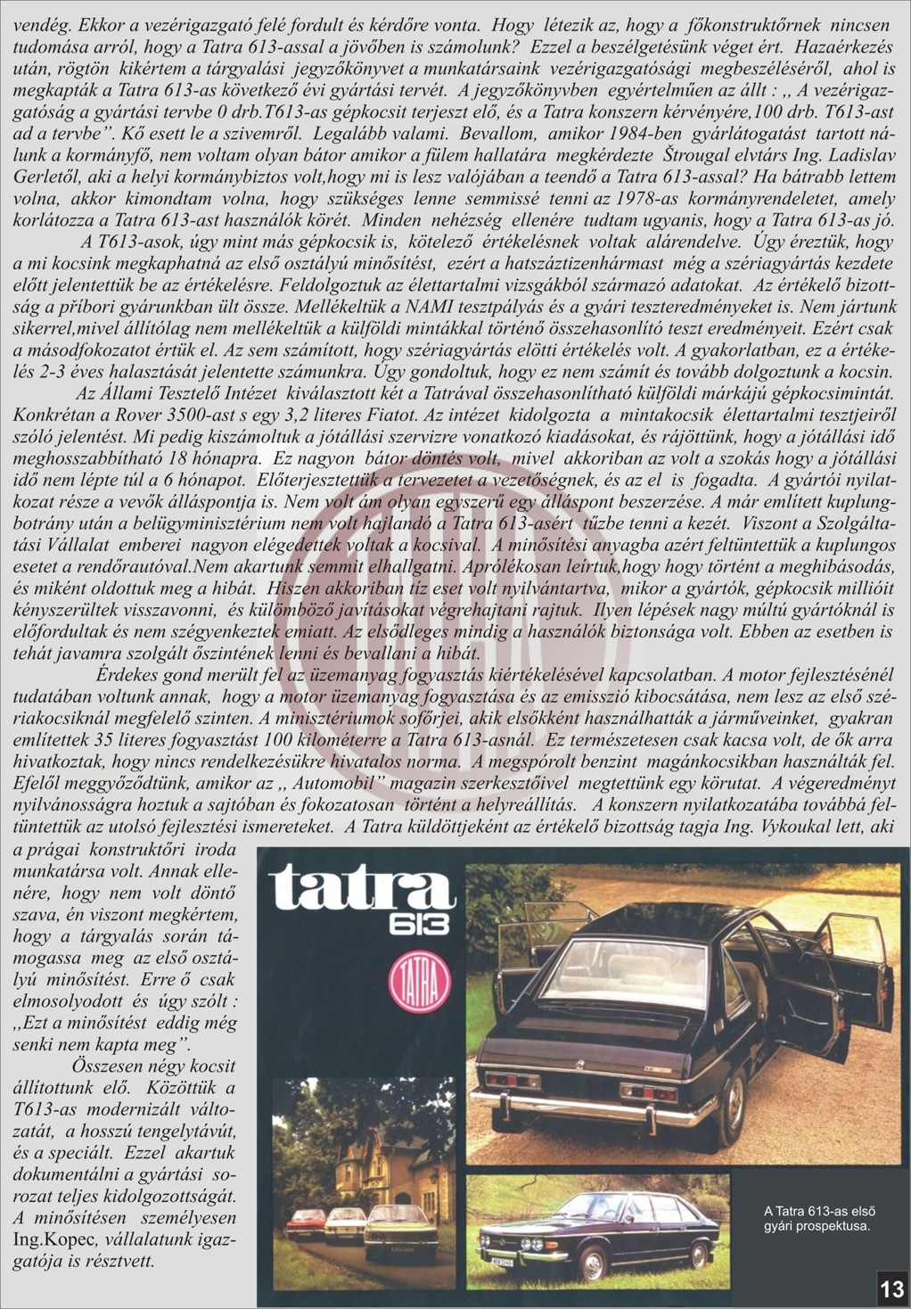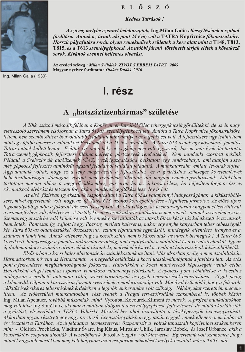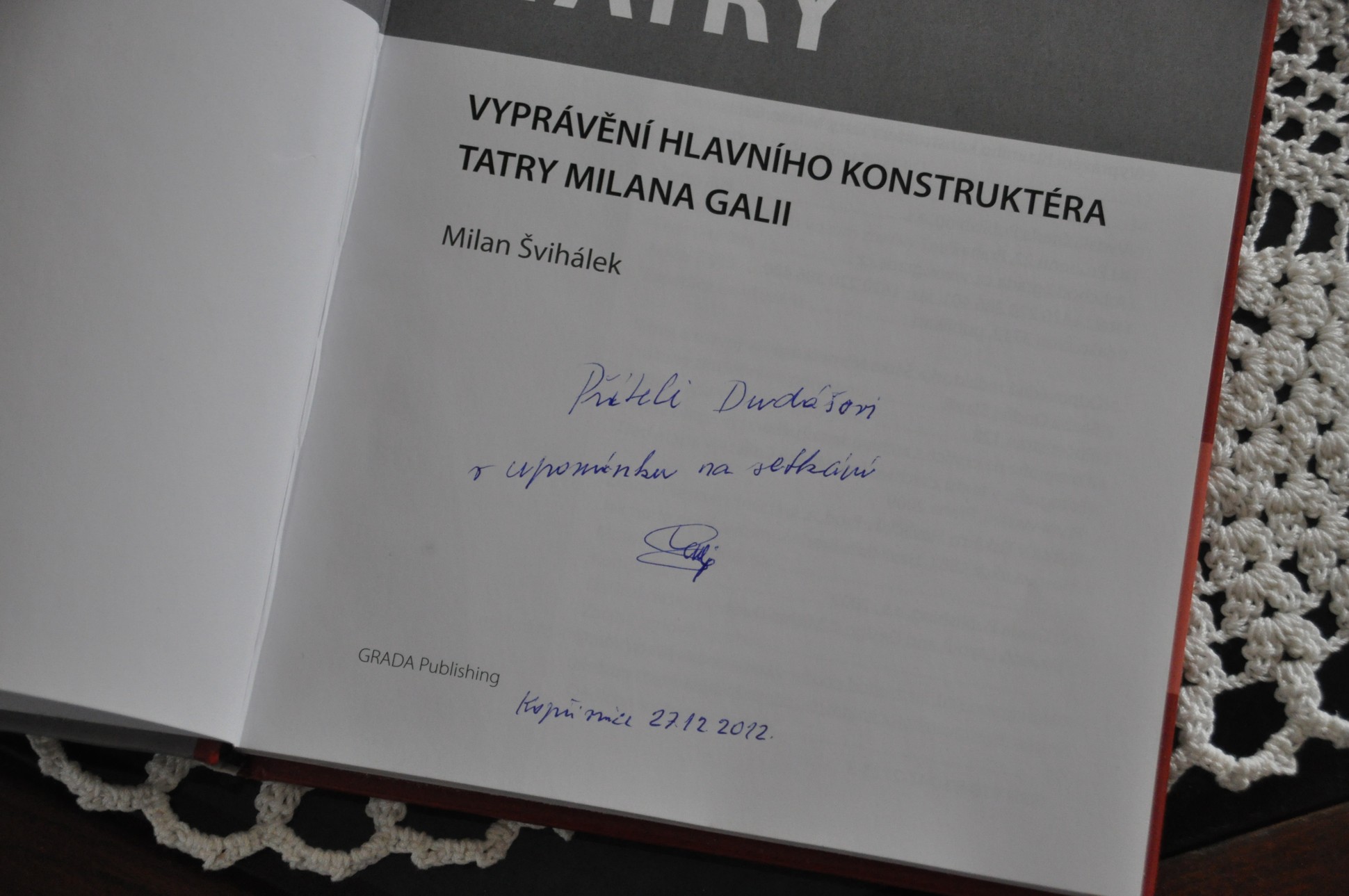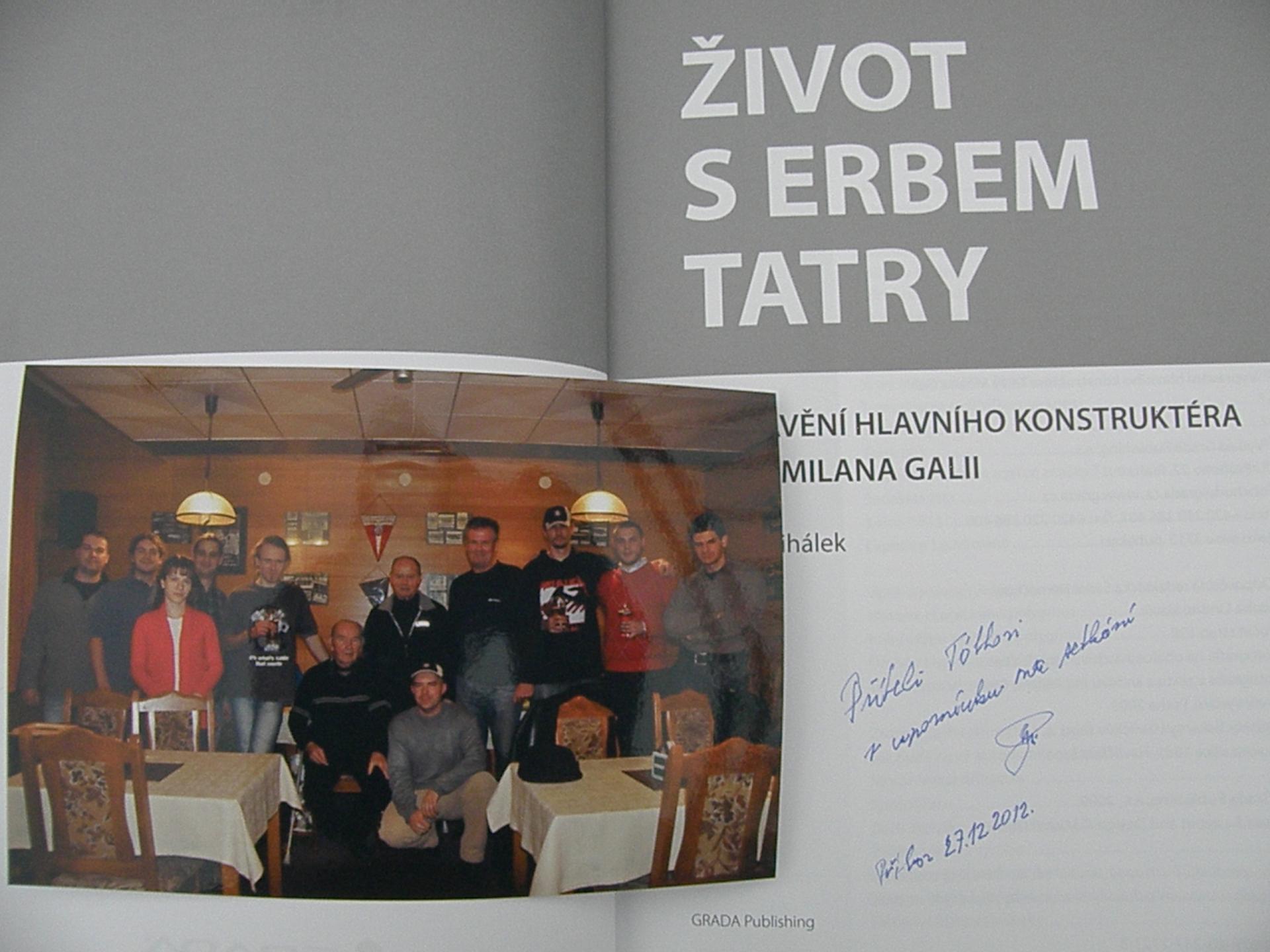 Zdravím vospolok. Dovoľujem si týmto založiť novú tému ,,STRETNUTIE S LEGENDOU" . Podnetom na to je skutočnosť že sa mi za pomoci Pána Dalibora Křenka podarilo zrealizovať ,,vianočné" stretnutie s výraznou osobnosťou spojenou s kombinátom TATRA Kopřivnice, bývalím dlhoročným šéfkonštruktérom Ing. Milanom GALIOM. Miestom stretnutia bol hotel ŠTADIÓN v Kopřivnici dňa 27.12.2012 a zúčastnili sa ho tatrováci zo slovenska a maďarska. Boli aj taký , ktorý pricestovali kvôli stretnutiu až z Veľkej británie. Predmetom a dôvodom stretnutia okrem zvedavosti prítomných o informácie zo zákulisia vývojových prác v bývalom kombináte a pridruženom závode TATRA Příbor a osobnom rozprávaní z úst p.Galiu vôbec, bola aj skutočnosť že na základe mojej iniciatívi som/sme zhotovili voľný preklad časti knihy p.Galiu (ŽIVOT S ERBEM TATRY)mojou osobou najprv do maďarčiny. Tento maďarský preklad následne preložil do angličtiny môj kamarát tatrovák žijúci v Anglicku. Anglický text sa následne po gramatickej korekcii p. Tisdale-om , ktorý je redaktorom časopisu pre Anglický Tatraklub, dostal dojeho 50-ho vydania, zatiaľ iba ako prvá časť. Druhá časť sa medzičasom nedopatrením stratila z databázi p.Tisdale-a ale bude samozrejme doplnená. Už prvá časť mala veľmi pozitívny ohlas v kruhu členov klubu, pretože obsahovala mnohé informácie zo zákulisia vzniku T613 o čom pojednáva náš preklad. Pán Galia bol veľmi nadšený a dojatý skutočnosťou že vďaka tomuto prekladu sa o jeho osobe dozvedeli aj v GB a v maďarsku čoho priamym následkom bolo aj toto stretnutie. Pán Galia nám dal svoje slovné a písomné požehnanie na voľný preklad ďalšých častí jeho pamätí. Ako odmenu, nám dedikoval svoju knihu.