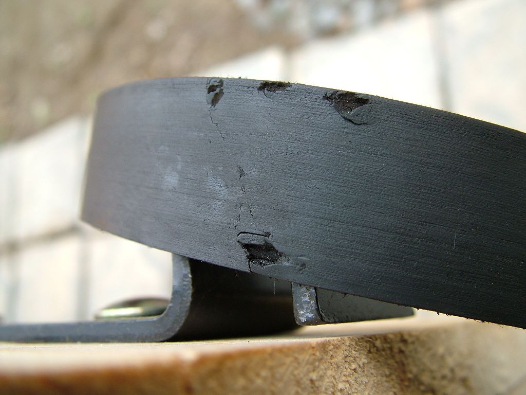 Ondrej: Tenhle řemen (nakousnutý) je ten který jsem sundal z druhé strany motoru kde to vydrželo. Nepřipadal mi povolený. Ten který se přetrhnul měl ale okolo místa roztržení taky nějaké takové "dolíky". Kromě toho byl sedřený na jedné boční hraně, ale to mohlo vzniknout až po roztržení když se vychýlil z trasy.