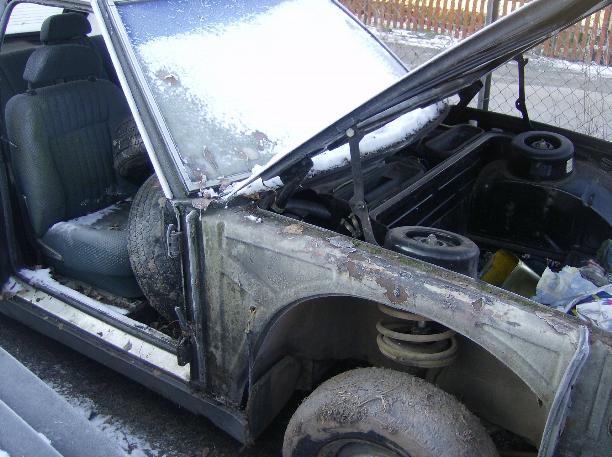 Protože poptřebuji uvolnit místo, auto nechám někomu vcelku, motor tam je Ečkový, funkční. Karoserie je zdravá - viz neshnilé podběhy... No a cena asi 12000Kč.