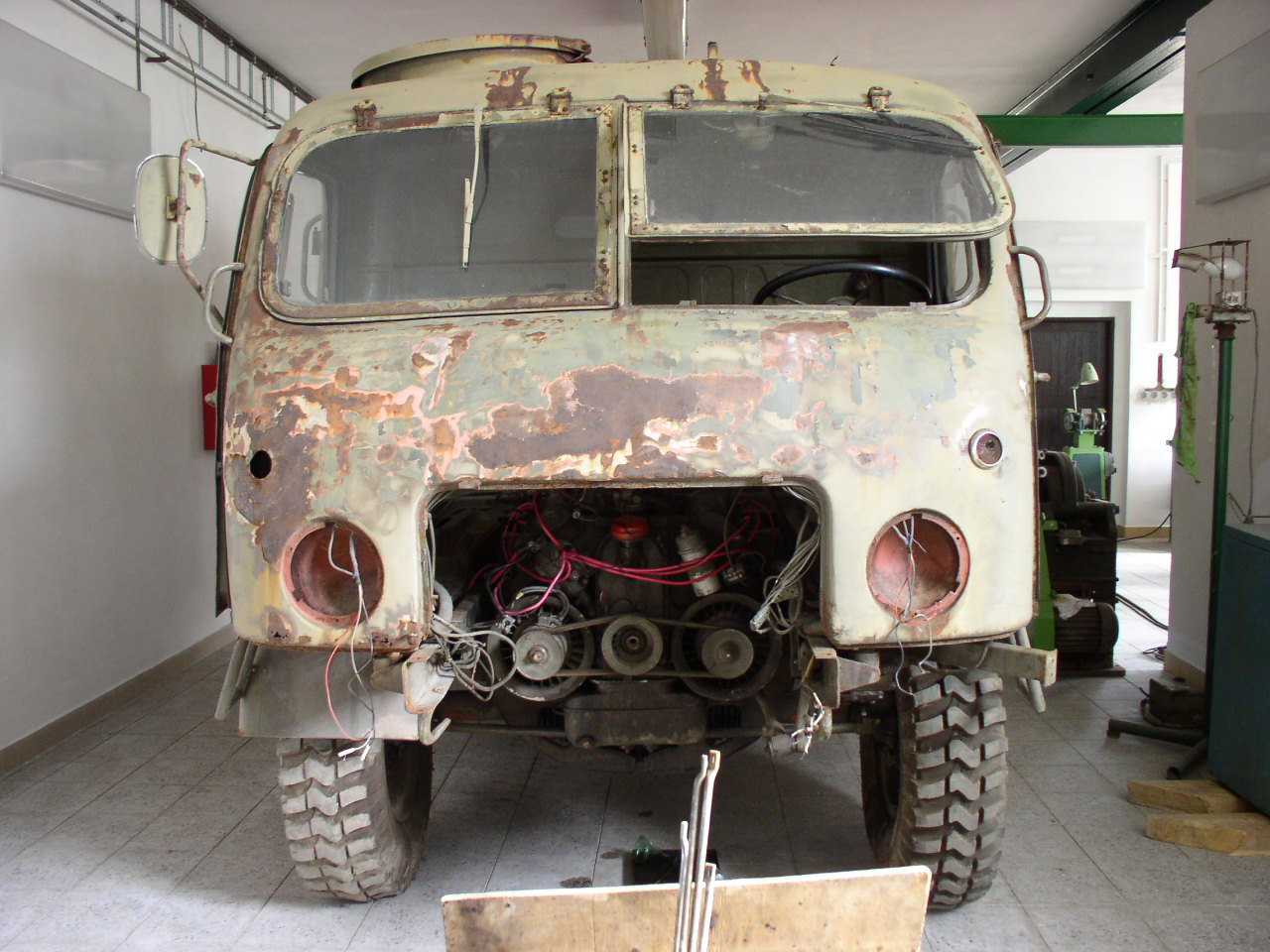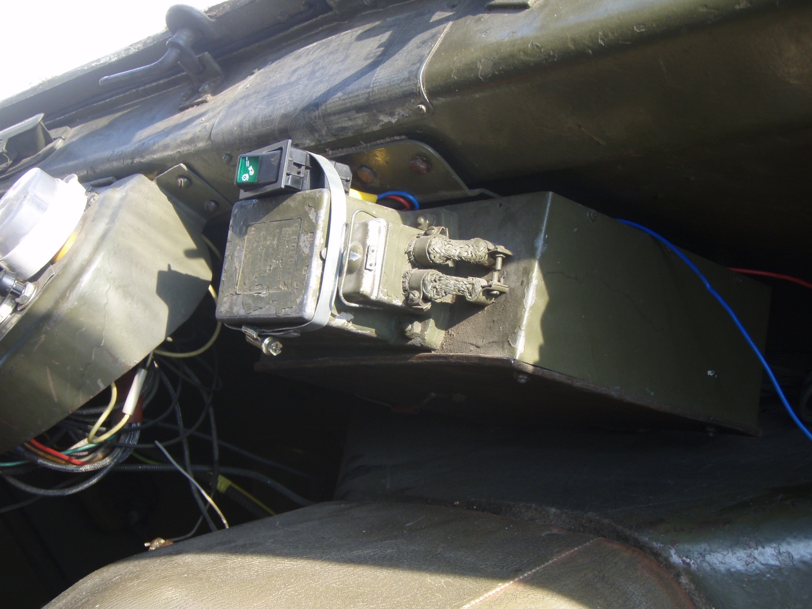 V prostoru za maskou jsou navíc asi odrušovací prvky, na přední stěně uvnitř kabiny je nějaký přístroj asi také k odrušení - BOSCH , na zadní stěně kabiny je nějaké relátko, či co ,