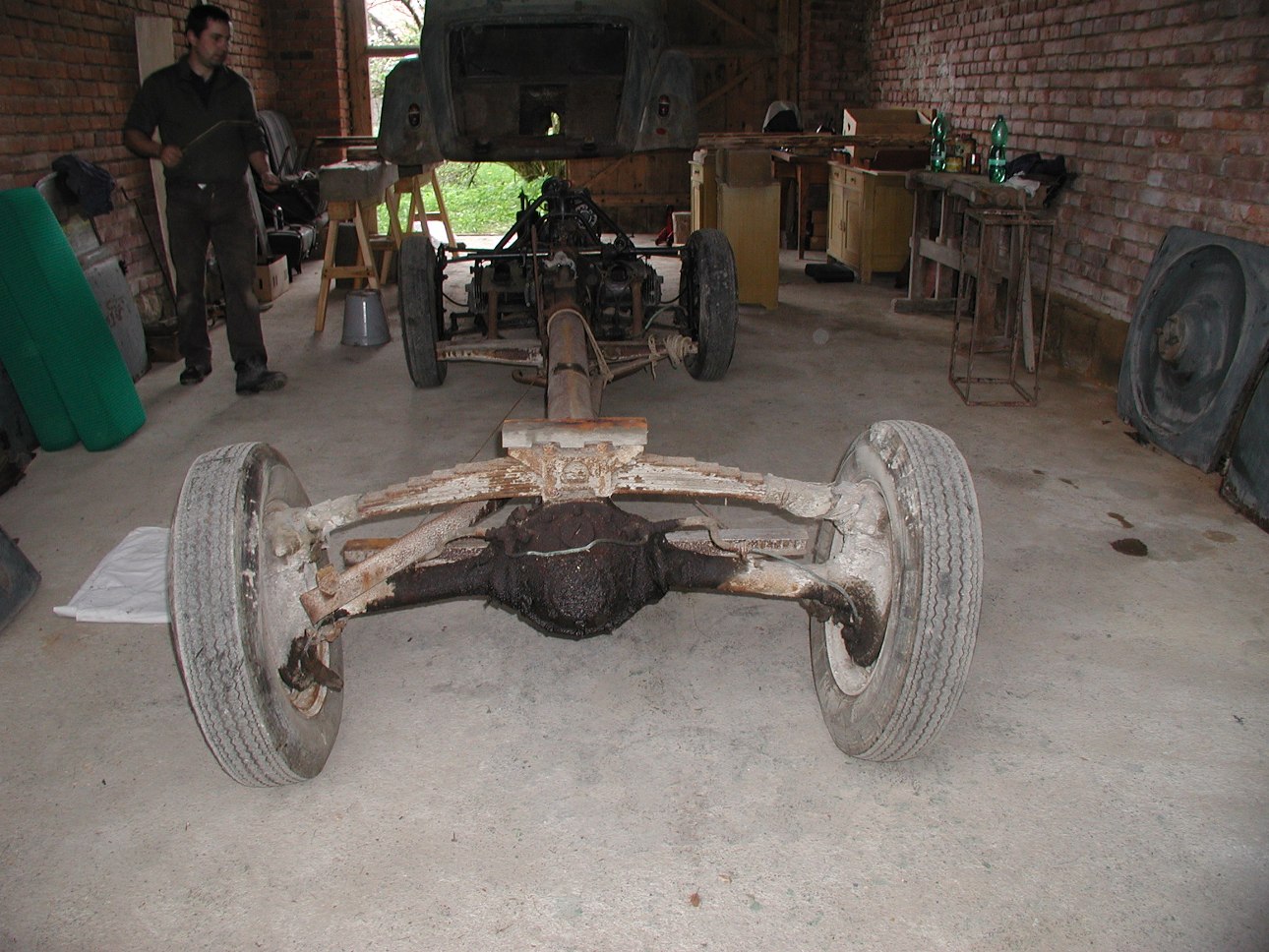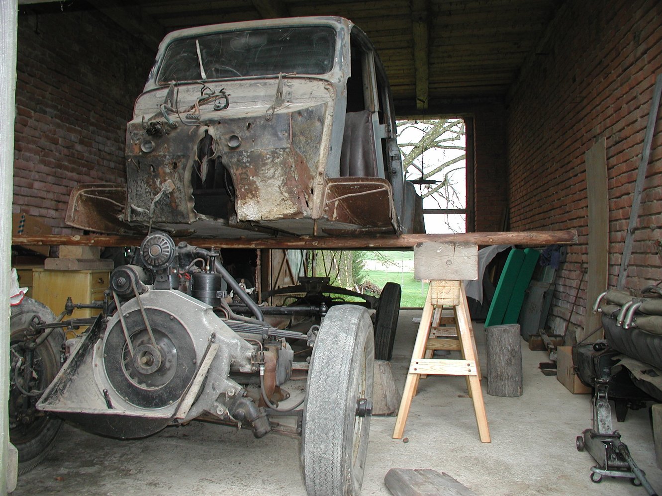Nakonec jsme karoserii ve výšce jednoho metru podložili příčně vloženými trámky a s podvozkem podjeli.