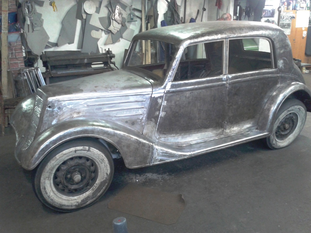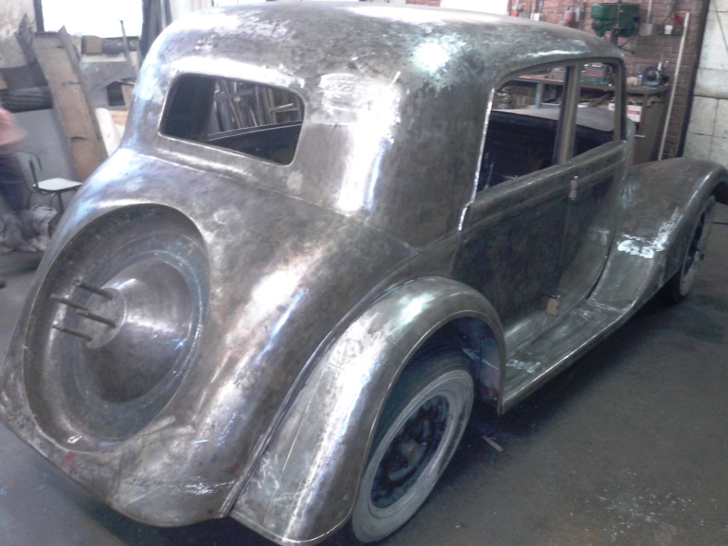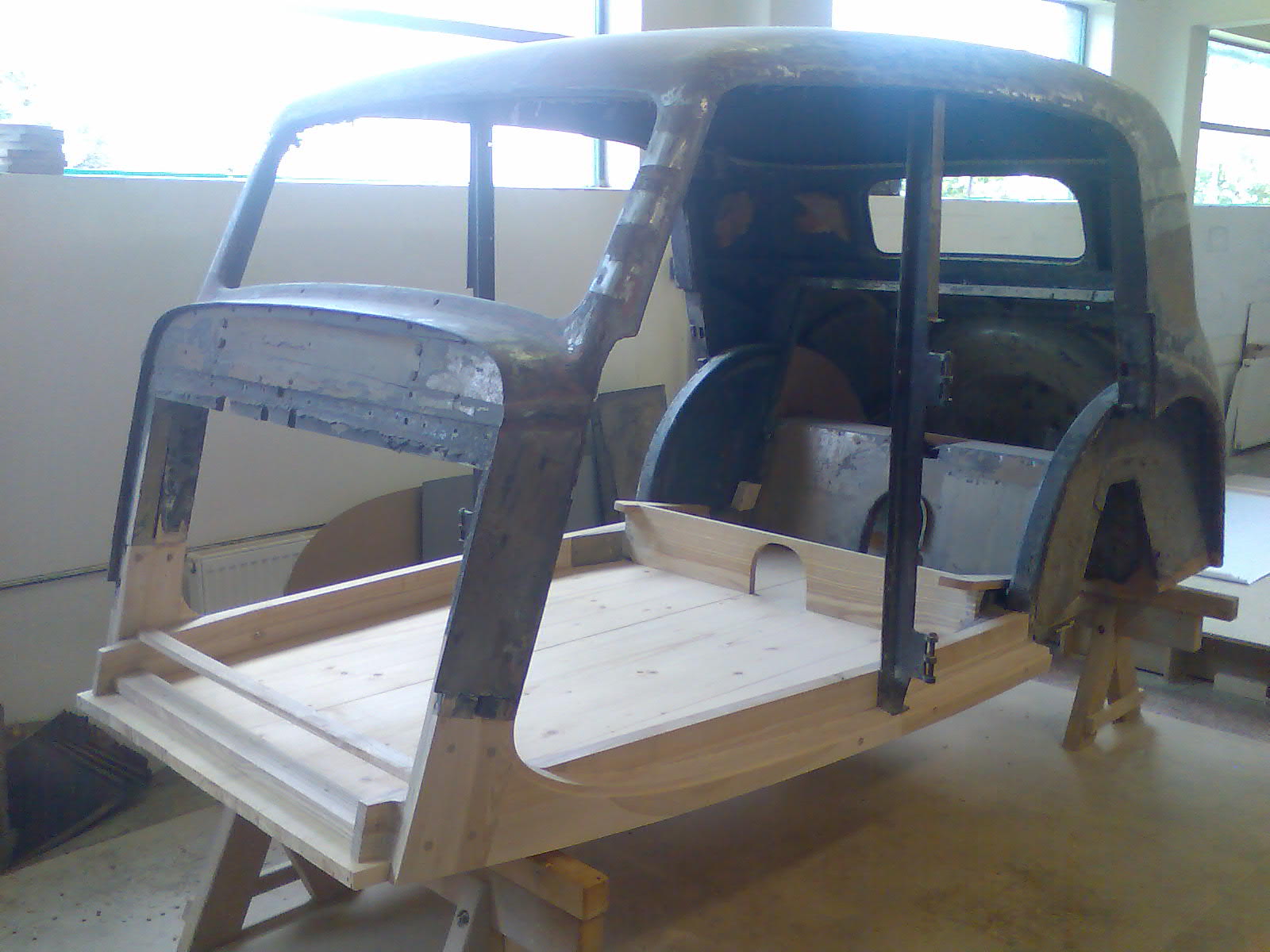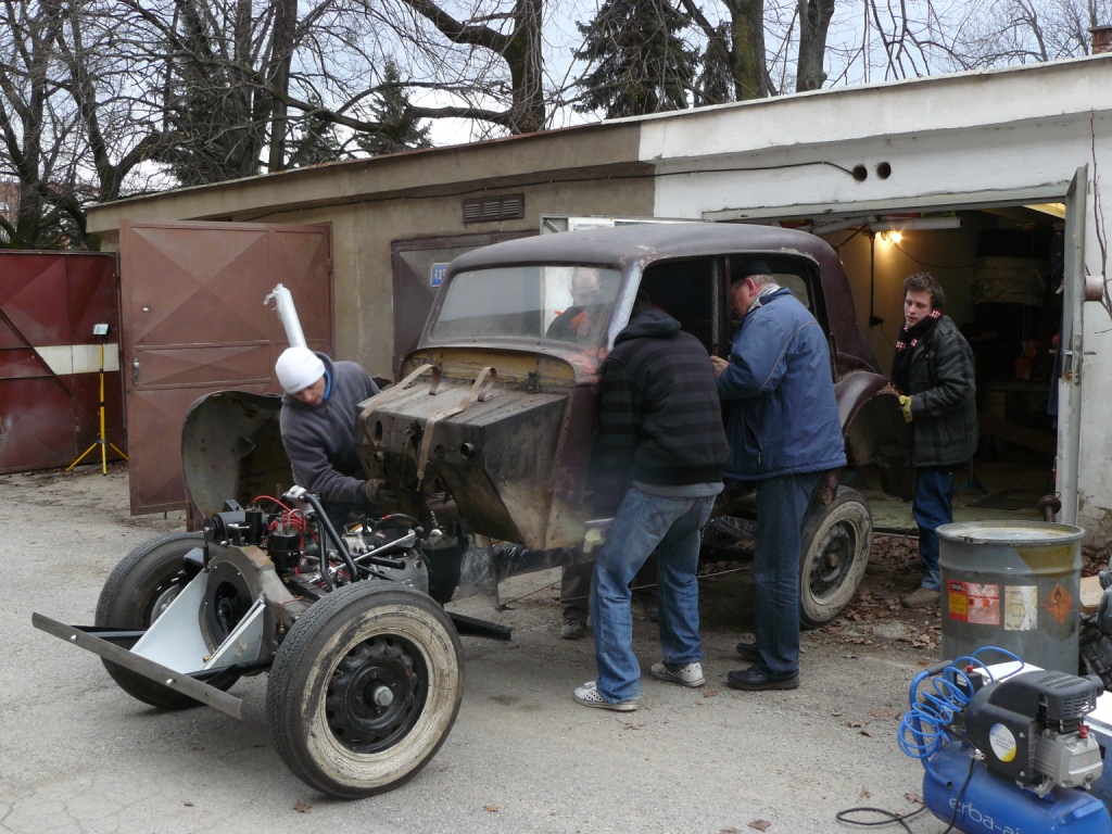 Usadenie karoserie, prevoz do karosarne po ocisteni od laku, oprava vydrevy.