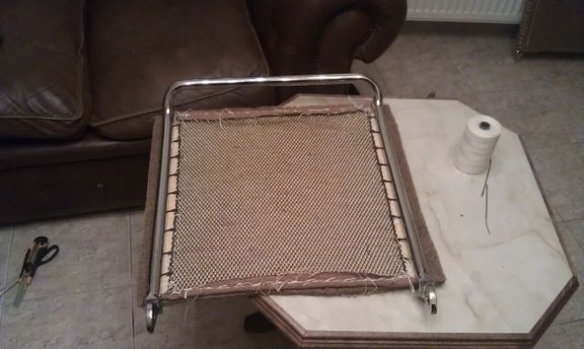 Najprv som rám obšil hrubým plátnom asi ako bol originál - je na obrázku č.3 . potom som položil jednu vrstvu gumožiny a obšil. Zlepší sa tým sedenie lebo nebudú na zadok tlačiť tie háčiky čo držia strunový výplet. To je ako podklad.