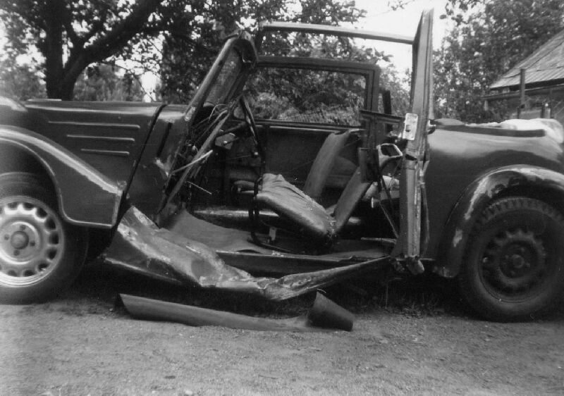 Pak jsem slyšel jak něco kape na něco rozpáleného (benzín na rozpálené výfuky) Chtěl jsem zavřít přívod benzínu, ale táhlo od kohoutu bylo úplně jinde, vypnul jsem bateriák a urychleně opustil vůz. Odtlačili jsme druhý vůz (Žigulík) a čekali kdy to bouchne.
