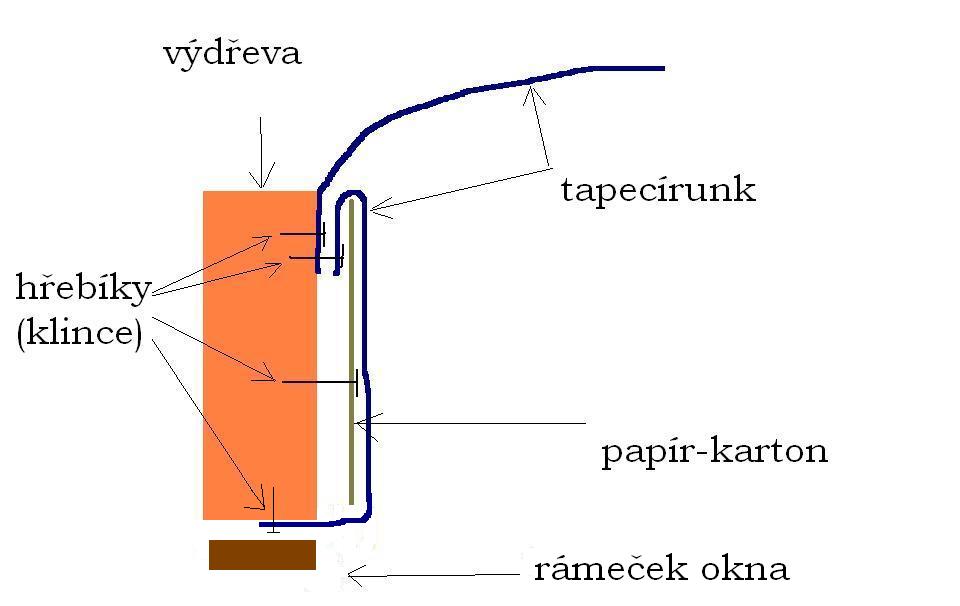Nad okny a vedle nich je pouze tvrdý papír (karton) přibitý hřebíčky. Nafotit to nemůžu, to bych musel to čalounění otrhat.
