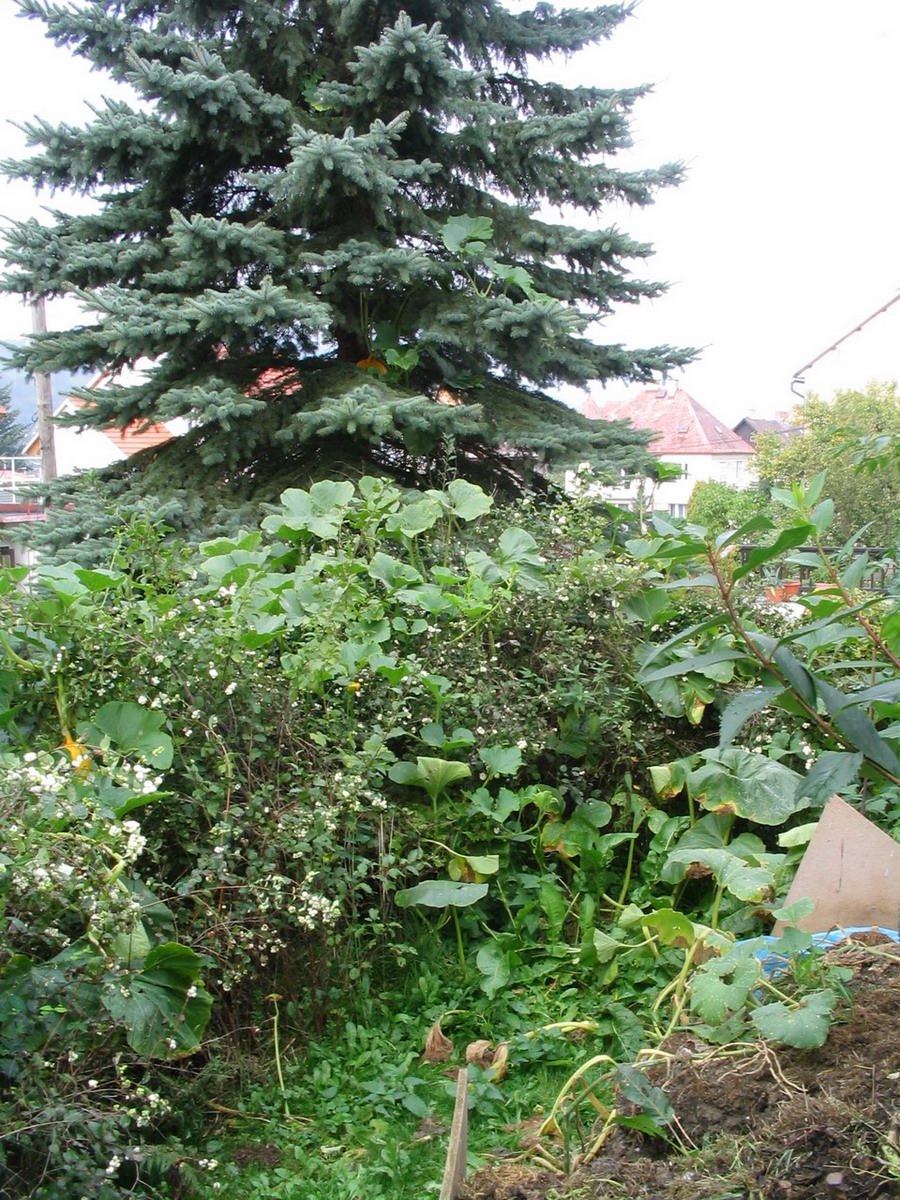 No ja tam vidim Picea pungens Argentea, dole pod nim je Symphomicarpos albus a lianu Turbante turco.