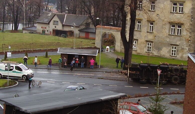 Dnes v pravé poledne nám za barákem složili pár kubíků dřeva. Složil to po projetí mírné pravé zatáčky, rovnou před autobusovou zastávku plnou lidí. Vlivem setrvačné síly se dřevo nezkoulelo rovnou na lidi v zastávce ale ještě chvíli pokračovalo společně s autem a rozsypalo se až pár metrů za ní