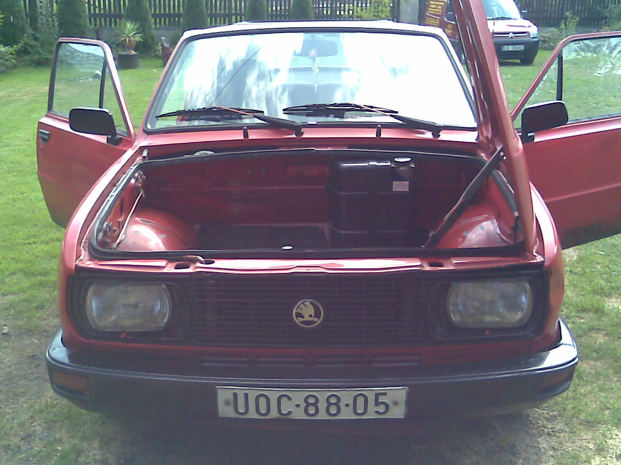 čo to tam je vzadu za zbastlenú Škodovečku?