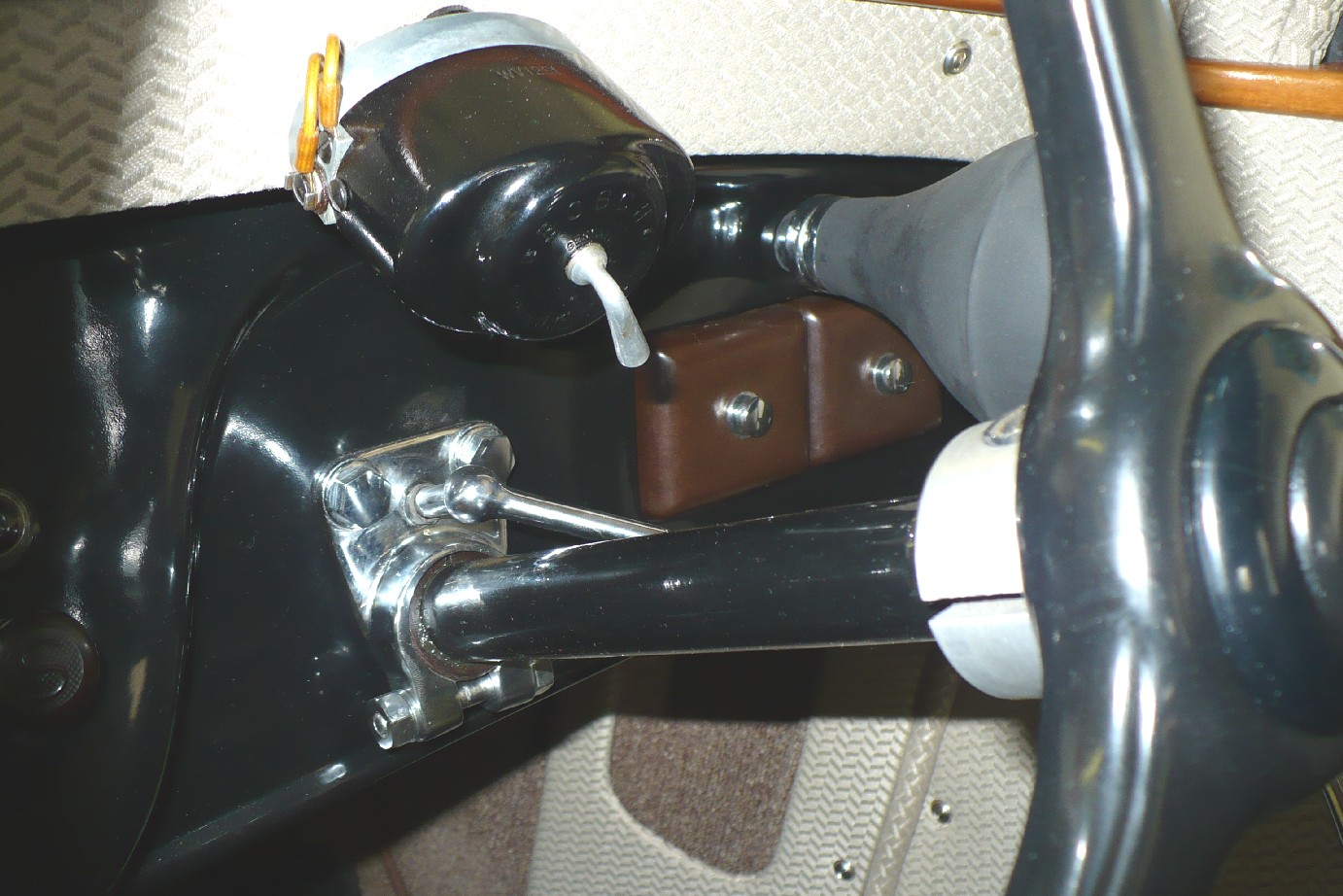 Krátké Áčko má balonek houkačky na palubce nad pojistkami, dlouhé Áčko má balonek pod palubkou (vpravo dole). Já mám bohužel v těch místech vyvedené samodomo ovládání předstihu a tak je balonek poněkud více ke středu palubky. Jak je v originále přichycený bohužel nevím, ale domnívám se že je tam jen nějaká jednoduchá objímka na (respektive pod) příčnou dřevěnou stěnou.