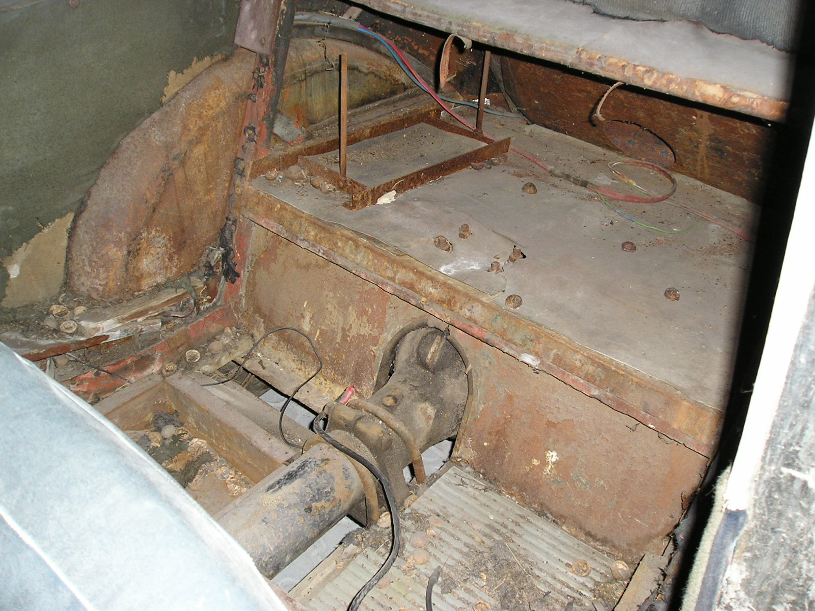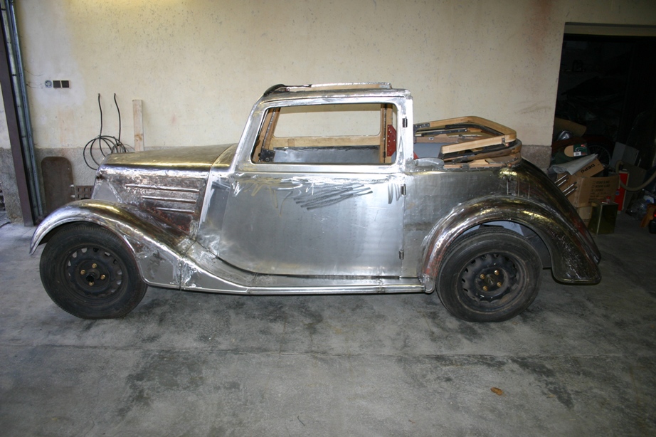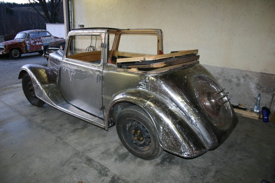 Néé, přední kapota je původní, povyvařený blatníky, zad. blatníky taky jenom vyvařený, zadní část je taky původní, ale spodek je opravený, protože byl uhnilý. Dveře a zad. boky, ty byli k nepoužití, tak ty se museli udělat, ale výdřeva je celá nová, teda až na jeden oblouk ze střechy. Motor, převodovka, rozvodovka a nápravy jsou po kompletní generálce.