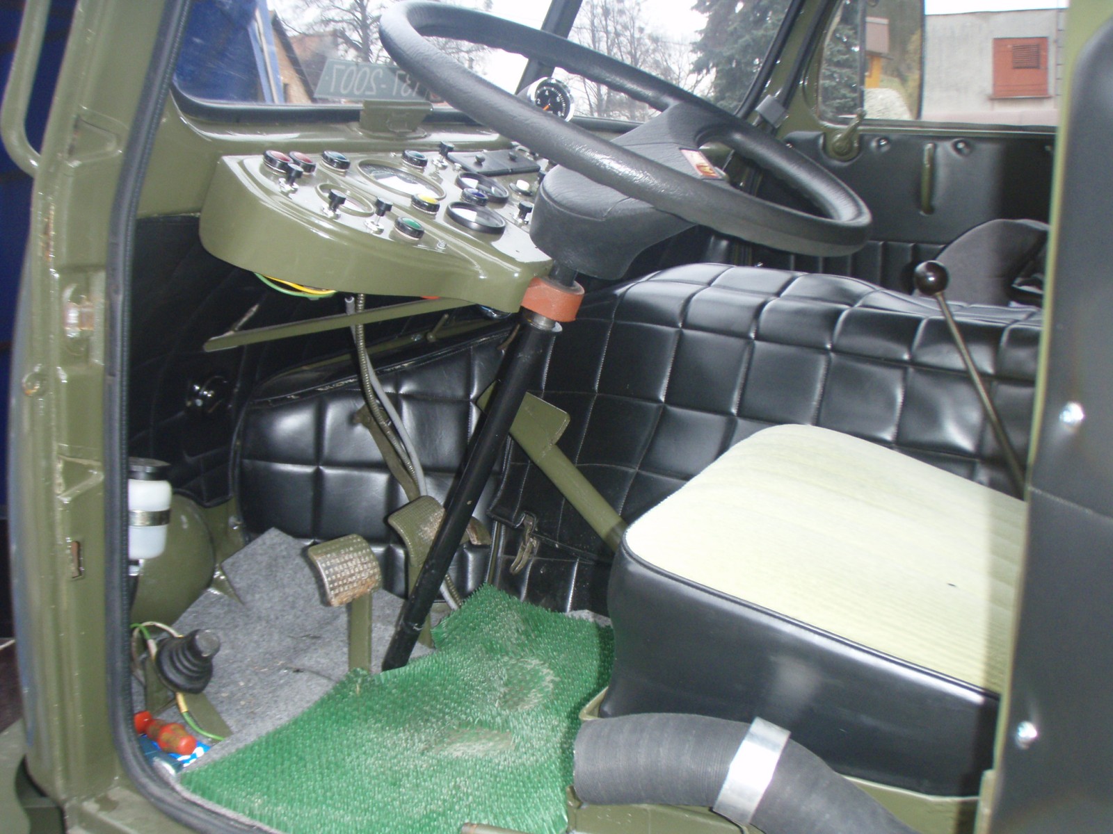 Volant je z nákladní TATRY , terrno . Zvolil jsem ho z více praktických důvodů. 1. je bezpečný - měkký- deformovatelný , což se o tom bakelitovém s kulatinou 10 mm a vyztužením do kříže nedá říct. 2. má na průměru větší průměr o 50 mm , což má lehce pozitivní vliv na zmenšení ovládací síly. 3. volant nepůsobí tak studeným dojmem při dotyku v mínusových teplotách, rychleji přizpůsobí svoji teplotu teplotě okolí .